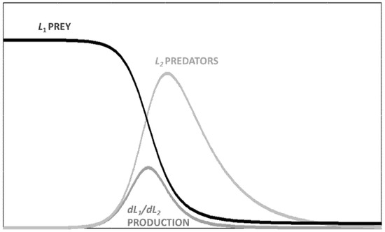 The SCLV model is not formally different from the standard LV model, since the only constraint for it is that it is supposed to describe a physical system and then the constants must not be <0. Nevertheless, we use the term SCLV (Equations (3) and (4)) to clearly identify this variant in the present paper. We already used this variant to describe such systems as the whaling industry, which exploits a resource (whales) that reproduces very slowly [27,37]. The resulting behavior for the production as a function of time is a single “bell-shaped curve” for both L2 stock and for the flow from L1 and L2 (with the dL1/dt labeled as “Production”). Instead, L1 decreases monotonically.