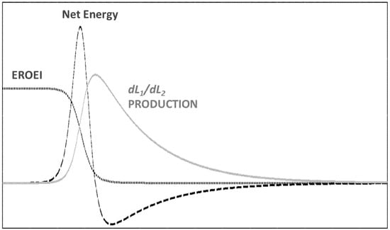 This is a relevant result relative to the discussion about peak oil, often centered on discussing how dwindling EROEI affects production [50]. Since, as we saw, “peak capital” occurs for EROEI = 1, the production curve will peak before the capital curve. This has been observed in studies based on the iterative solution of the LV equations [37,43,44].