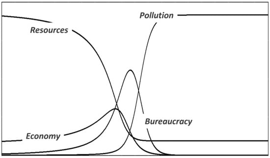 Example of the dissipative 3-stock system: the collapse of a complex society (from Bardi et al. [67]).
