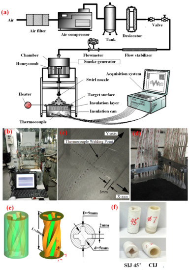 Figure 1e shows a schematic diagram of the nozzles during the experiments. Three-dimensional (3D) printing technology was used to fabricate the nozzle, with an accuracy of ±0.2 mm. A guiding tube with a height of 10 mm was added to the upper part of the nozzle in the hope that the airflow enters the nozzle in a stable state, and in actual use, the large pressure-stabilizing chamber will ensure the stability of the inlet airflow. A smooth tube with an inside diameter measuring 7 mm was also fabricated (CIJ) to analyze the effect of the threaded nozzle, as shown in Figure 1f. More information on the experimental device can be found in our previous work [34].