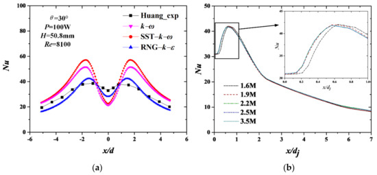 Figure 3a shows the calculated values of under different turbulence models. The distribution trend of the calculated values of the three turbulence models is basically consistent with the experimental results. In the central stagnation point region, the calculated values of the three turbulence models are relatively consistent, with a large deviation from the experimental values. It is speculated that the reason is that the air flow in the stagnation point region is slow, and the laminar flow is near the target plane. The use of the turbulence model to simulate laminar flow will inevitably lead to large prediction errors. In terms of peak point prediction, the calculated results of the model are in good agreement with the experimental values, while the values of the and models are larger than the experimental values at the two peak points, and the peak positions are migrated radially outward. The results show that the model has good precision and high efficiency in the impact cooling of the rotating jet.