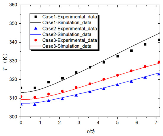 Figure 4 shows a comparison of some of the experimental data and numerical results in this work. It can be seen that the temperature of the jet impingement surface under three different working conditions (as shown in Table 2) is in good agreement with the numerical calculation results. The comparison results further indicate that the turbulence model, the gas–thermal coupling calculation method, and the corresponding mesh number used herein can accurately predict the heat transfer rate between the swirling impinging jet and the CIJ under the experimental conditions.