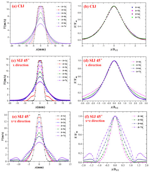 Velocity distribution of different sections: (a) CIJ, (b) dimensionless data of CIJ, (c) SIJ 45°, (d) dimensionless data of SIJ 45° along the x-direction, (e) SIJ 45°, and (f) dimensionless data of SIJ 45° along the x = z direction.