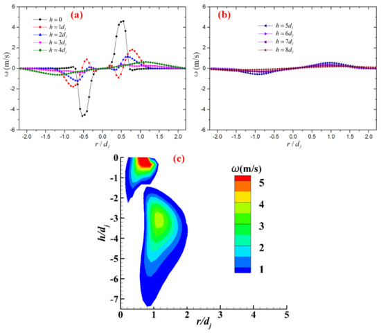The rotating jet flows out of the nozzle at an initial velocity, and the core potential flow is drawn into the jet by friction with the stationary fluid around it. Due to the existence of tangential velocity, it will increase the mixing effect with the surrounding stationary fluid, thus increasing the spread area and mass flow rate of the cooling jet. So, the area of the heat transfer region and its heat transfer rate will increase accordingly. Figure 7 shows the attenuation curve of tangential velocity (ω) of SIJ 45°. It can be observed that the airflow rotates outside the center at the exit of the nozzle, and the tangential velocity gradually decreases with the further development of the jet. When , the tangential velocity almost decays to 0, and when and , the tangential velocity has multiple peaks.