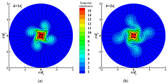 The tangential velocity vectors at different jet distances are intercepted for further analysis, as shown in Figure 8. When , the airflow ejected from the nozzle rotates and diffuses around, is sucked and coiled by the core potential flow of the central hole, flows to the central hole, and then is carried and outflows by the rotating airflow in the center, resulting in four strong vortices with the symmetrical distribution. This also explains why the tangential velocity has multiple peaks of positive and negative alternations in the x-direction of the cross-section. As the jet continues to develop, the core potential flow gradually weakens. When , the core of the potential flow is interrupted, and then the entrapment capacity of the central flow is further weakened. Only a small amount of the tangential airflow scattered along the center is sucked back to the center and continues to diffuse around in a weak rotational condition.