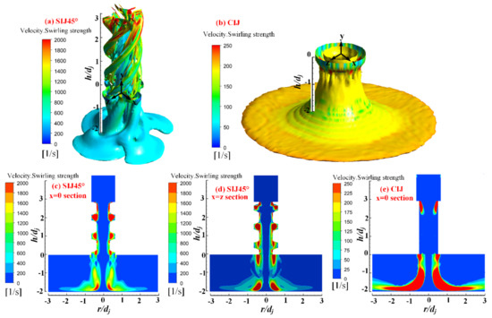 Vortex contour (Re = 4000, h/dj = 2): (a) SIJ 45°, (b) CIJ, (c)in the x = 0 section for SIJ 45°, (d) in the x = z section for SIJ 45°, and (e) in the x = 0 section for CIJ.
