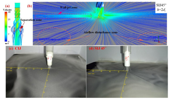Three-dimensional (3D) streamlines of SIJ 45° in (a) nozzle outlet and (b) target surface. Smoke flow field with (c) CIJ and (d) SIJ 45° (Re = 6000, h/dj = 2).