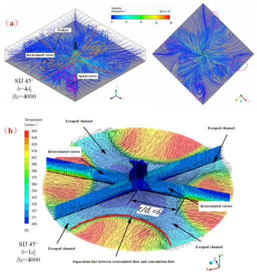For the CIJ, the ability of airflow to escape in all directions is the same, with obvious symmetry, as shown in Figure 9b. For SIJ 45°, under the action of tangential velocity airflow, the entrainment effect on the surrounding airflow is stronger so that more cold airflow acts on the target surface and the tangential airflow forms large-scale vortices in the four escape directions at the same time.