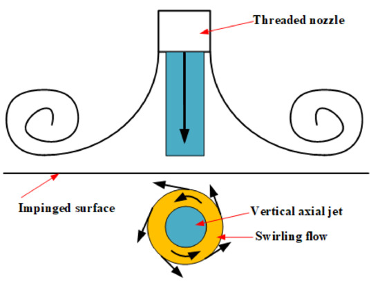 Compared with the CIJ, the swirl impinging jet (SIJ) has both tangential velocity and axial velocity [5]. The flow ejected from the nozzle has large diffusivity, fast energy and momentum dissipation, and a large impingement cooling area, which are helpful to improve the uniformity of cooling. Meanwhile, the swirling jet has the high turbulence of a large-scale vortex, and the combination of tangential and axial velocities enhances the heat transfer rate of the target surface. Because of the complexity of the flow phenomenon and the wide range of applications, the swirling jet has become one of the hot issues among heat transfer researchers [6,7]. At present, there is no consensus on the flow mechanism and features of the SIJ, and additional research is required.