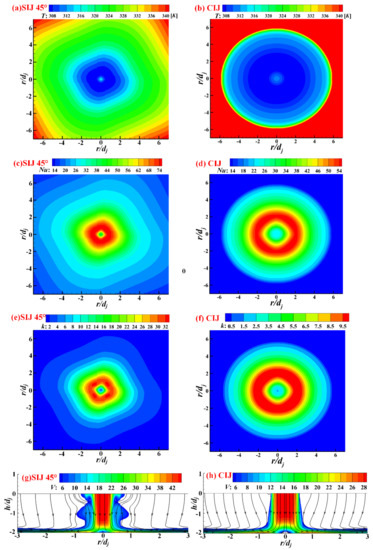 Figure 10c,d shows the smoke flow field for the CIJ and SIJ 45° at Re = 6000 and h/dj = 2. For the CIJ, after the airflow impinges on the target surface, a uniform scattered wall jet is generated. The velocity begins to fluctuate and weaken, and there is no recirculation entrainment at . When the jet continues radially outward, the velocity is further decreased, the airflow disturbance is enhanced, and the wall jet starts to split, resulting in a strong backflow vortex at about . For SIJ 45°, the wall jet becomes even compared with the CIJ, the wall jet scatters in the “petal” type, and the backflow is further weakened in the whole jet area.