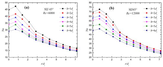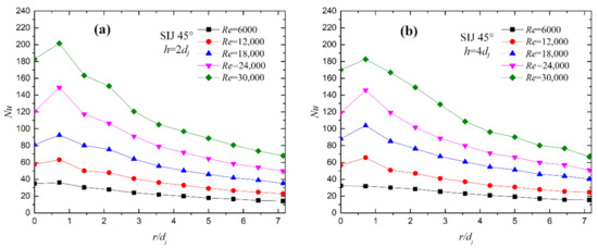 - As the increases, the Nu for SIJ gradually decreases, and the maximum Nu transfers to the peripheral area, which enhances the heat transfer uniformity.