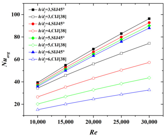 Comparison of average Nu values of SIJ 45° and that of CIJ in [44].