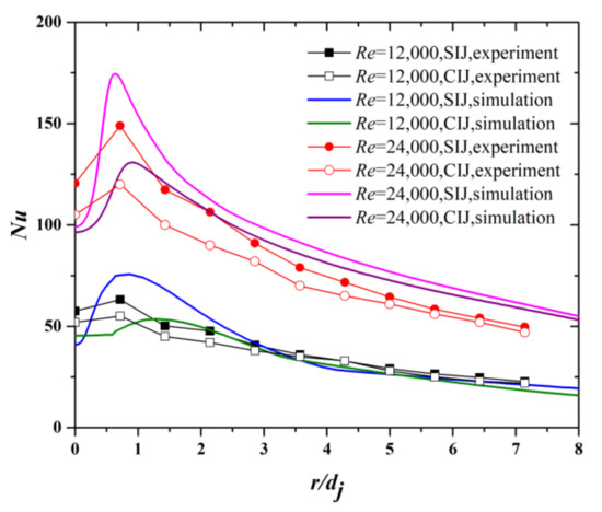 Figure 19 gives a comparison of Nu values between SIJ 45° and the CIJ with experimental and numerical methods. It can be seen that Nu values of SIJ 45° are higher than those of the CIJ, which coincides with the Nu contours in Figure 11. In addition, the experimental results are in good agreement with the numerical results.