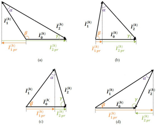 In this regard, the next step is to consider the different relative positions of the currents’ vectors. All possible options were classified into four cases, presented in Figure 2. For each case, the PSS current’s vector 0(h) is located horizontally, and they differ in the ratio of the projections of the consumer’s current vectors 1(h)/2(h) on the total current vector 0(h), which are respectively equal to 1pr(h) and 2pr(h). Additionally, the vector diagrams show the angle α between the vectors 1(h) and 2(h), β between the vectors 1(h) and 0(h), and γ between the vectors 2(h) and 0(h).