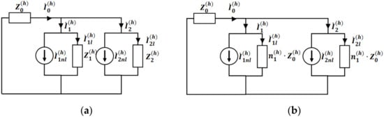 In Figure 3, 0(h) is the PSS harmonic current, Z0(h) is the PSS impedance for harmonic h, 1(h)/2(h) is the first/second consumer’s harmonic current, 1nl(h)/2nl(h) is the non-sinusoidal current generated by the nonlinear load of the first/second consumer, and 1l(h)/2l(h) is the non-sinusoidal current consumed by the linear load of the first/second consumer.