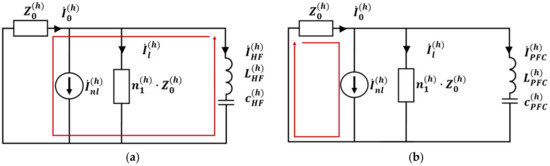 A harmonic filter is presented as capacitance and inductance , which, when connected in series, create a resonant circuit with a nonlinear load for harmonic h. In this regard, most of the current generated by the nonlinear load flows through the filter, which is the essence of using the filter as shown in Figure 4a. So, there is no sense to calculate the projection of , , and on because tends to zero and tends to infinity. Basically, the harmonic emission problem for harmonic h is solved in this situation. Concerning other harmonics, the impedance of the harmonic filter increases according to the increase in the impedance of . So, the harmonic filter for the non-resonant frequency shows the properties of the linear load, which is confirmed further in Section 3.2.2.