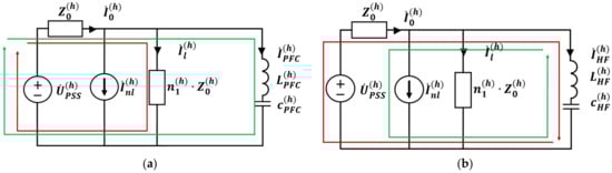 Considering Figure 5a, the nonlinear load is the least affected by non-sinusoidal voltage because it can be replaced by , which remains constant regardless of the grid parameters. This feature is typical for most types of nonlinear loads, and for this reason, replacement with current sources is a common practice. However, not all nonlinear loads are independent of the external conditions, so the question of nonlinear loads’ equivalent circuits is a topic for additional research. Concerning linear loads and power factor correctors, the non-sinusoidal voltage causes currents that are drawn as red and green lines in Figure 5a, respectively. If the grid side distortion is not significant compared to the nonlinear load, then these currents are much less than and do not affect . This situation is considered in Section 3.2.4. If the dominant harmonic source is located at the utility side, then these currents increase considerably and does not represent accurate information. However, in this case, identification of the grid side harmonic source is essential to transfer the obligation to compensate for these distortions from the consumer to the PSS.
