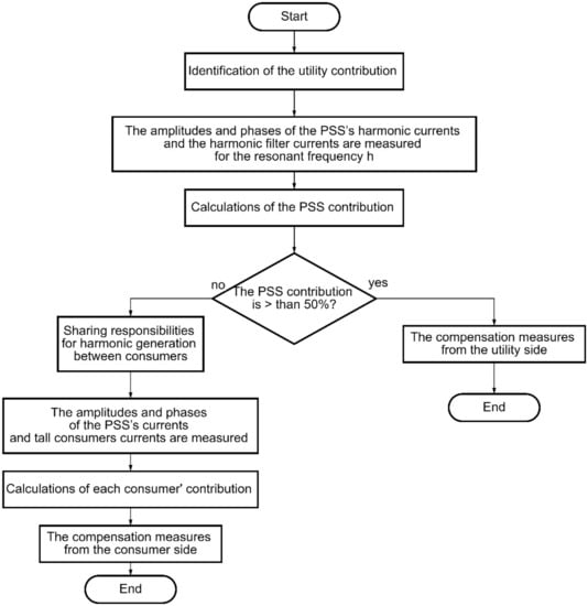- Calculations of the PSS contribution are made according to (12). If the utility is the dominant source (contribution is more than 50%), then no additional measures to eliminate harmonics at the consumer’s side should be provided since the measures from the utility side are paramount. If the grid side distortions are low, then sharing of the responsibilities for harmonic generation between consumers can be achieved.