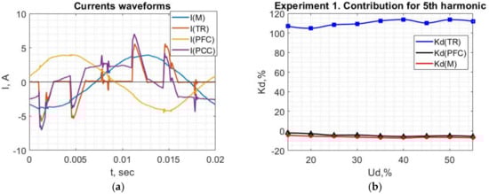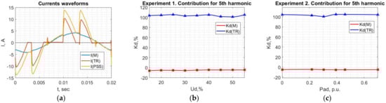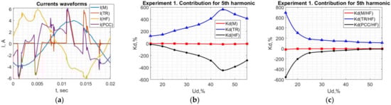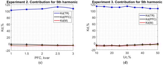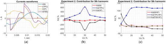 Considering Experiments 2–4, when PFC is connected, the oscillograms of the measured currents and voltage are provided in Figure 21a. At the same time, the contributions relative to the current of the PCC are presented in Figure 21b–d. It can be noted that PFC’s and M’s contribution is close to each other and these loads are clearly identified as linear. The change in the consumer’s harmonic generation nor the parameters of PFC does not affect the calculation result. Only the varied utility side harmonic source leads to a slight decrease in the amplitudes of and .