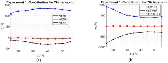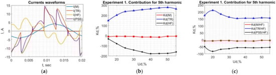 It can be seen in Figure 12b that TR’s contribution is about 265%, M’s contribution is about −5%, and TR’s contribution is about −160%, when Ud is more than 35%. When this value is lower, the calculation results do not give 100% in sum due to the small harmonic emissions, which do not allow an accurate calculation. It is especially notable when measurements for each consumer are not carried out simultaneously. Based on the obtained results, it can be concluded that HF can be characterized by a negative value of the contribution, which means HF compensates for the harmonic emission of other consumers whose contributions are positive. Furthermore, the contribution of M is still a small negative value, which shows the absence of M’s harmonic emissions and its low compensation ability. Considering the contributions relative to HF(h), in Figure 12c, it is shown that TR is a dominant source of harmonic currents, when current that flows through the PSS causes a negative contribution of about −55%. It indicates an absence or extremely small harmonic emission from the utility side.