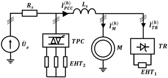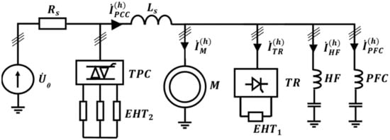 The previous scheme (Figure 1) does not take into account the influence of the harmonic currents of the first consumer on the consumed current of the second one and vice versa. Since real consumers cannot be divided exclusively into sources or consumers of harmonics, the following equivalent circuit (Figure 3) is considered. Electric power consumers are represented by both the current sources and the linear loads to show their generation and consumption of harmonic currents.