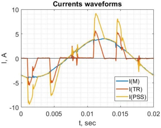 Considering the power factor correctors, most of them include the inductance , which, firstly, decreases the starting current and, secondly, creates a resonant circuit for the frequency that is lower than the smallest harmonic. Since it is the 3rd harmonic, the resonant frequency is, for example, 134 Hz. It leads us to the conclusion that, similarly to the harmonic filters, power factor correctors have the properties of linear loads for non-resonant frequencies. It means the currents and are of the same order of magnitude. A detailed analysis of the contribution of the power factor corrector with a detuned frequency of 134 Hz is presented in Section 3.2.2.