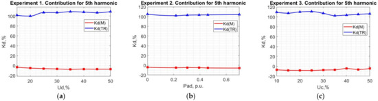 Compared to block 1, the contribution of TR slightly increases from 104% to 107% and the contribution of M changes from −4% to −7%, which does not significantly affect the conclusions that can be drawn according to the data obtained. Concerning Experiment 3, TPC as a source of harmonic emission from the utility side does not significantly affect the calculation results and the changes in the values are in the confidence interval of the calculations and measurements.