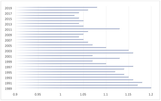 Figure 1. Reduction of CO2 emissions from 1989 to 2019 [Mg CO2/MWh].