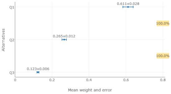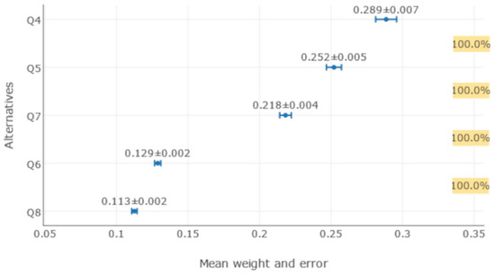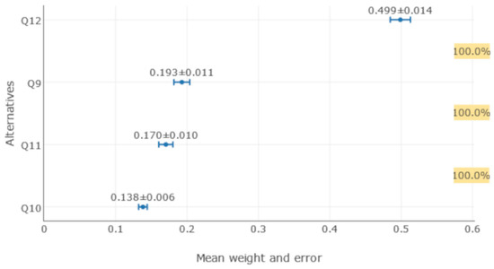The objective of the methodology was to assess the importance of each survey question and to determine a weighted average MreVR for each sustainability research area of the marketing portfolio. The importance of specific questions was determined using the QSP Multi-Criteria Decision Support Software [7] recommended for non-heuristic methods that contribute to pioneering pairwise comparisons, i.e., pairwise comparison techniques with verifiable accuracy and reliability [8] which will not be discussed herein. The importance of twelve questions was examined from the perspective of their influence on each diagnosed area of sustainable marketing mix development. The importance of the questions was derived from pairwise comparisons developed by a group of experts whose characteristics are presented in supplementary files. Preferences for the entire group of experts which were applied in the process were based on the experts’ individual judgments which later were geometrically averaged [70] and processed with QSP Software [7]. The outcome of the process is presented below (see Table 4, Table 5, Table 6, Table 7, Table 8, Table 9, Table 10, Table 11 and Table 12 and Figure 2, Figure 3 and Figure 4).