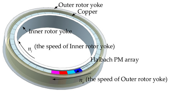 Figure 1 shows the structure of an ECC with a Halbach magnet array. It consists of two rotors: an outer rotor and an inner one. The conductor is on the surface of the former, and the Halbach magnet array is on the latter’s surface.