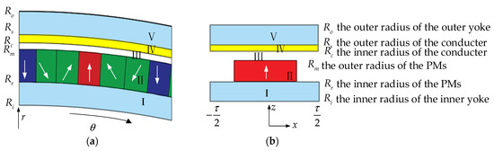 Figure 2a,b show a cylindrical ECC’s circumferential and axial cutaways with a three-segment Halbach permanent magnet. The Halbach arrays are distributed along the circumferential direction. The copper is a little longer than the PMs for higher PM utilization rates in the axial direction.