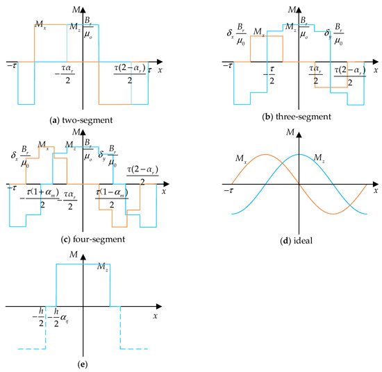 Figure 4 shows the magnetization components of the arrays, where δx = |sinθ|, δy = |cosθ|. Mx is an odd function for all four typical Halbach magnet arrays, and Mz is an even function along the x-direction. In the z-direction, as the relative velocity is zero, all regions are extended periodically by the imaging method, and Mz is a homogeneous harmonic even function, as shown in Figure 4e.
