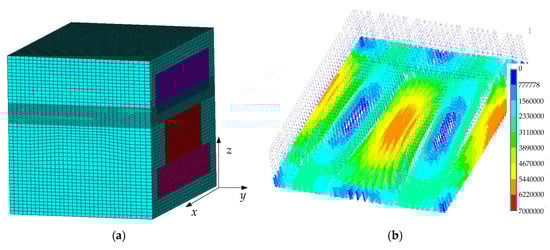 Considering the structural periodicity of the proposed ECC, only a pair of magnetic poles of this volume is needed to be analyzed. Figure 5a shows the field and grid of the ECC. The mapping mesh with a hexahedron shape is adopted, where the numbers of nodes are 151,040, and elements are 142,506.