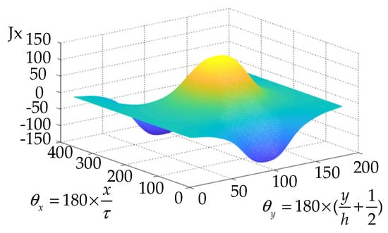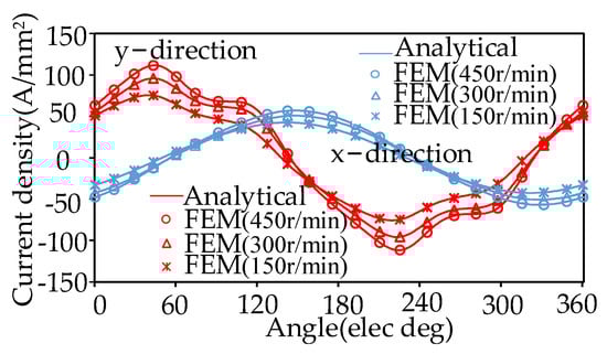 Figure 7 presents the eddy-current density distributions along the x-direction in the middle of the copper at z = Rc + 3/1000 and y = l/2, obtained by proposed analytical Equations (32)–(34) at different speeds. Figure 8 shows the 3D eddy-current density components at z = Rc + 3/1000, in which the x-direction component of the induced current is null at y = ±h/2.