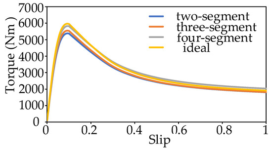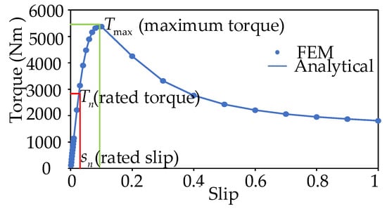 Figure 9 shows the change in the electromagnetic torque in the analytical method when the slip is changed from 0 to 1 (the rated speed is 1000 rpm). The rated slip and torque of the ECC are 0.02 and 2850 Nm, respectively.