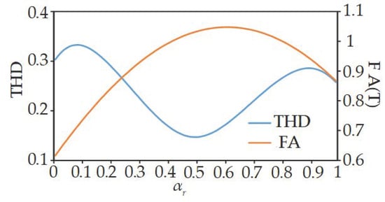Taking the model shown in Figure 3b as an example, Table 2 lists the preferred and worst results of the THD and FA. When αr = 0.35 and θ = 54°, the preferred THD is 0.1270, and the preferred FA F1 is about 1.1051 T. When αr is changed to zero, and θ is changed to 90, the FA decreases rapidly.