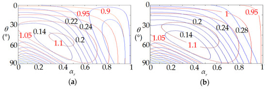 The predicted contours of THD (black numbers) and FA (red numbers) of (a) three-segment and (b) four-segment Halbach magnet array. αr represents the x-direction length ratio of the z-direction magnetized PM to τ. θ represents the angle of the angular magnetic PM.