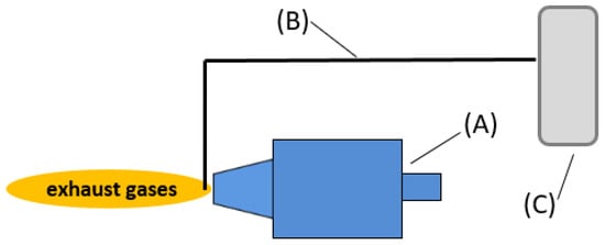 Test rig (A)—miniature test engine, (B)—exhaust pipe, (C)—exhaust gas collection and storage system.