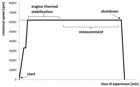 The tests were carried out for all test fuels according to the same sample profile (Figure 2). Two independent tests were performed for each fuel. After starting the engine on a given fuel, the rotational speed was gradually increased. It was assumed beforehand that measurements would take place at one selected engine performance condition, i.e., 62,000 rpm. The choice was dictated by the fact that this speed corresponds to approx. 30% of the value of the maximum thrust force for a miniature turbojet engine. The 30% thrust value occurs during the certification procedure in the field of gaseous emissions from aircraft turbine engines [].