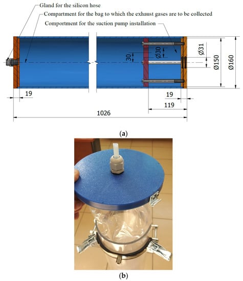 Exhaust gas collection and storage system: (a) technical diagram; (b) illustrative photograph.