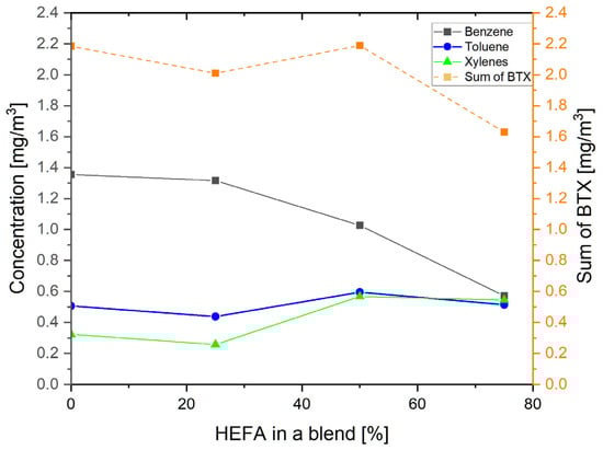 The measured concentration values of volatile organic compounds in the exhaust gases emitted by the GTM-140 miniature engine are shown in Figure 4. The main focus here is on the compounds from the BTX group—i.e., benzene, toluene and xylenes, due to their highest harmfulness among the identified compounds. The most harmful of the BTXs is benzene. In this case, it turns out that the more HEFA component a fuel blend contains, the lower benzene concentrations are obtained. On the other hand, it can be observed that the concentration of toluene and xylene tends to increase with increasing share of the component in the mixture. Nevertheless, the decreasing trend of benzene is dominant here. The aggregate comparison of BTX (orange colour in the graph) also shows a decreasing trend in the harmfulness of the emitted exhaust gases from the miniature engine with an increasing share of the synthetic component in the tested fuel blends.