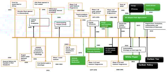 The global trend in transportation industry transformation and the South African automotive revolution began in 1924, with the emergence of energy consumption and carbon emissions regulation (Figure 1). In 2011, the South African government held an automotive week in East London, with emphasis on achieving a green economy. As a developing country, to remain competitive and relevant, South African automotive manufacturers have to adjust to the green economy to survive the future trend.
