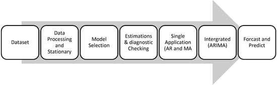 ARIMA models represent different types of TS. This assumes future values have linear correlation with current and past values, which, by approximation, is not adequate for non-linear problems []. ARIMA is a statistical base method for prediction using historical data [] that gained popularity among researchers due to its vast applications in manufacturing []. The models are known for their notable forecasting accuracy and flexibility in different applications []. ARIMA models as a univariate is an expression of how variables respond with stochastic dissimilarity [,]. The popularity of these is due to the statistical properties proposed by Box and Jenkins in the 1970s [], with a forecast value that is dependent on the lagged value of the previous values.