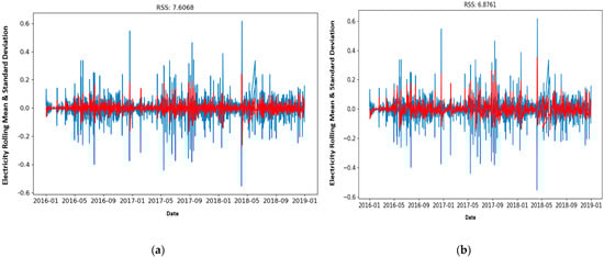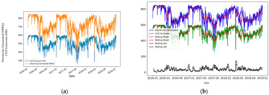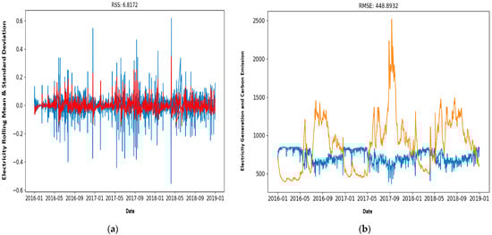 The model provides predictions for the calculation of RSS to determine the auto-regression model (p) using the differencing of the phrased dataset (d) to make the TS stationary in a supervised learning approach with dependency on the lagged residual error from the applied moving average model (q) in Figure 3, which is based on the original data collected for this study. Figure 4 presents a graphical representation of the pre- and post-estimation, eliminating trend and seasonality. This depicts the elimination of the residual electricity generated and CO2 data errors and seasonality components of the phrased dataset in terms of the rolling mean and standard deviation.