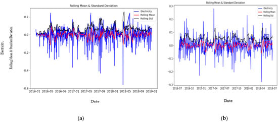 Test results: (a) pre−estimation, eliminating trend and seasonality; (b) post−estimation, eliminating trend and seasonality.