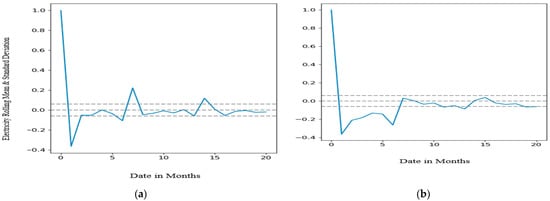 The trend, seasonality, time variance and other non-linear properties in the observed data, as deduced through time plotting, help to determine the different possible order and logarithmic transformation for variance stabilization side by side sample plots of autocorrelation functions (ACFs) and partial autocorrelation functions (PACFs) []. Auto-regression specifies a regression of a variable against itself. The model forecasts the variable using a combination of past value linearity of the variable []. In the real world, where there is a lot of uncertainty and change occurring rapidly, energy consumption and carbon emissions vary due to uncertainty, with many random series experiencing periodic change. Adjusting these non-stationary periodic stochastic processes, according to periodic intervals, eliminates the periodicity effect on the forecasted results []. With the stationary models methodology, some adjustments were needed before modelling of non-stationary series. It was important to plot the data and analyze it visually, as shown in Figure 2, which gives a graphic representation of the data. Dickey and Fuller [] stated that different trends and stationarity of the same TS imply different predictions and hence the “unit root test” was applied to determine use-forecasting models for different applications. The statistical procedure employed a unit root test to determine the stationarity commonly used for the test. Augmented Dickey–Fuller (ADF) tests investigate the stationarity and integration of the variables, and test the design based on the null hypothesis []. Estimation was applied to a selected model to determine the maximum likelihood in back-casting, as postulated by Box and Jenkins (1976). Diagnostic checking is the vital principle of ARIMA that describes stationary times, and it is imperative for the identification process to transform TS data to stationary values via pre-differencing transformation. Estimating and eliminating the trend are considered important transformations in reducing the trend in the case of a significant positive trend; transformations can be applied to penalize higher values more than smaller values. In this study, we applied log transformation, a moving average considered by the average of the past years, i.e., 12 values. The rolling mean of the past 11 values was not defined, but windows 12 defined the exponential decay. Differencing can eliminate (or reduce) a trend and seasonality []. To determine the stationary, we considered two methods in statistical procedures: the rolling average [] and an augmented Dickey-Fuller (ADF) test []. Rolling averages are a chart analysis-type technique used to examine collected survey data over extended periods to smooth out data series []. Pretorius et al. [] further elaborates the analysis of the model’s stability in a more visual technique.