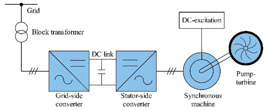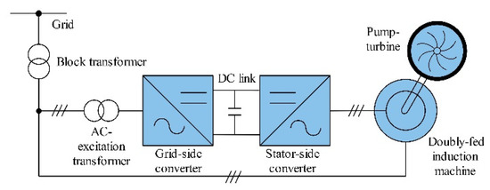 Power generation technology and the application systems of renewable energy have grown rapidly for the past several years in China, which has brought huge challenges to the grid stability and a significant structural change of electrical power production. The discontinuity of renewable energy and the inconsistency between power generation supply limits the large-scale integration of energy systems, especially in autonomous systems where renewable energy is the main source [1,2,3]. Usually, these composite renewable systems employ rechargeable storage devices to balance the inconsistency of power generation and supply, therefore, pumped storage plants are widely applied for this purpose [4,5,6]. As a giant natural battery, pumped hydro storage is the most effective technology in the energy storage system [7,8]. It can play a regulatory role as an energy storage tool, such as frequency regulation of the power grid [9], and load regulation of isolated power systems. Research on the improvement of pumped storage units in terms of efficiency and regulation characteristics has been the focus for many years [10,11,12]. Due to the reversibility of pumped storage units, the hydraulic design cannot meet the parameter requirements in both operating modes, Therefore, the unit is likely to operate at the off-design point for a long time, resulting in low efficiency, which is not conducive to the service life of the runner [13,14]. To solve this problem, the key technology of variable-speed pumped storage units with fast response capability and wide adjustment range has been proposed and studied [15,16,17]. Several studies have revealed that pumped storage stations with up to 70% can be operated efficiently by applying variable-speed technology [18]. To realize the variable-speed operation of hydropower plants and maintain the constant-frequency connection to the grid—the power electronic component frequency converter, which is more commonly used in wind power plants—is used [19]. Then, several variable-speed methods are proposed, and the structures of the two connection methods of variable speed hydropower units, which are more frequently used at present, are shown in Figure 1 and Figure 2.