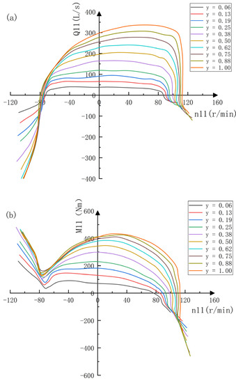With frequently changing operating conditions and the complex internal flow field, it is difficult to obtain a mathematical model that is consistent with the actual situation [32]. Generally, the model of a pump-turbine can be expressed quantitatively through model tests, where the model test is a simulation test on the test bench based on various conditions (including the switching process) that are actually possible, and the relevant data are recorded to form the full characteristic curve, as shown in Figure 4, in which the horizontal axis is unit speed and vertical axis is unit discharge or unit torque, respectively. According to the similarity law, unit speed n11, unit discharge Q11, unit power P11,and unit torque are defined in Equation (2) [33,34].