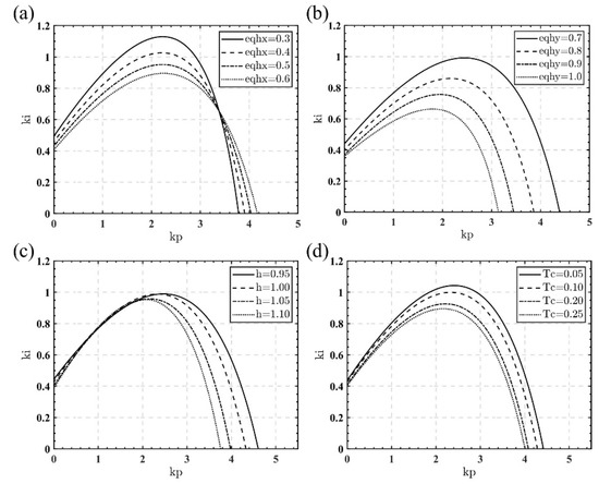 In terms of the calculation of the stability domain equations in the previous section, some specific visual representations of the stability boundary are illustrated. Set the unit inertia time constant, water flow inertia time constant , and self-regulation coefficient [37]. Substitute into Equation (14); then, the effect of the parameters on the trends in the stability domain during the variable-speed process is analyzed. Two coefficients are defined here, which represent the effect of changes in speed and opening on the regulating system, respectively: ; . Figure 7 shows the variation of the stability domain for various parameters under different working conditions.