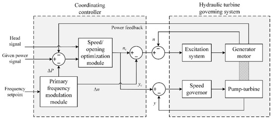 Different from the conventional hydropower regulating system, the control command is not a fixed value, it can be varied with the head and power signal, calculated by the optimization module or the cooperative control device. The specific calculation process will be described in Section 4.2.